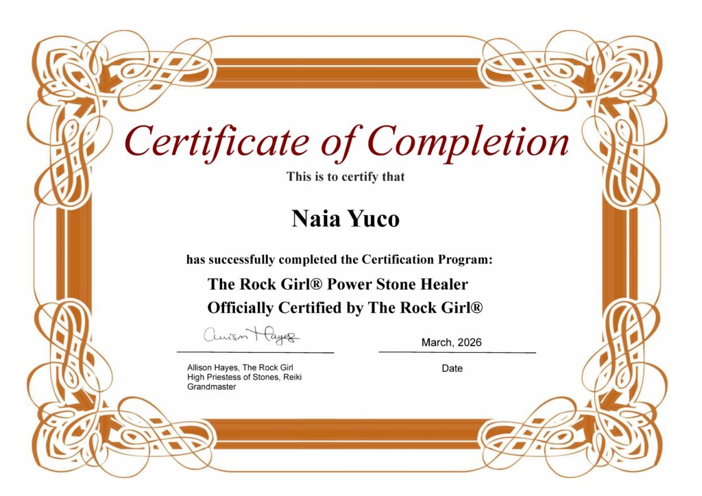 Allison Hayes The Rock Girl®の元で2年間に渡りチャクラとエネルギーフィールドの浄化と活性化・深層魂ヒーリング・過去生ヒーリングの3つのヒーリング技術を習得し、オンラインで対面と同等のフルセッションが可能なヒーラーとして認定を取得しています。